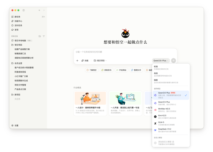 悟空作为阿里巴巴企业级 AI旗舰应用,承担着将模型最新技术成果与企业真实需求对接的关键角色,已率先接入 Qwen3.6-Plus,为用户带来编程能力更强、执行效果更优、性价比更高的企业级 Agent 使用体验。