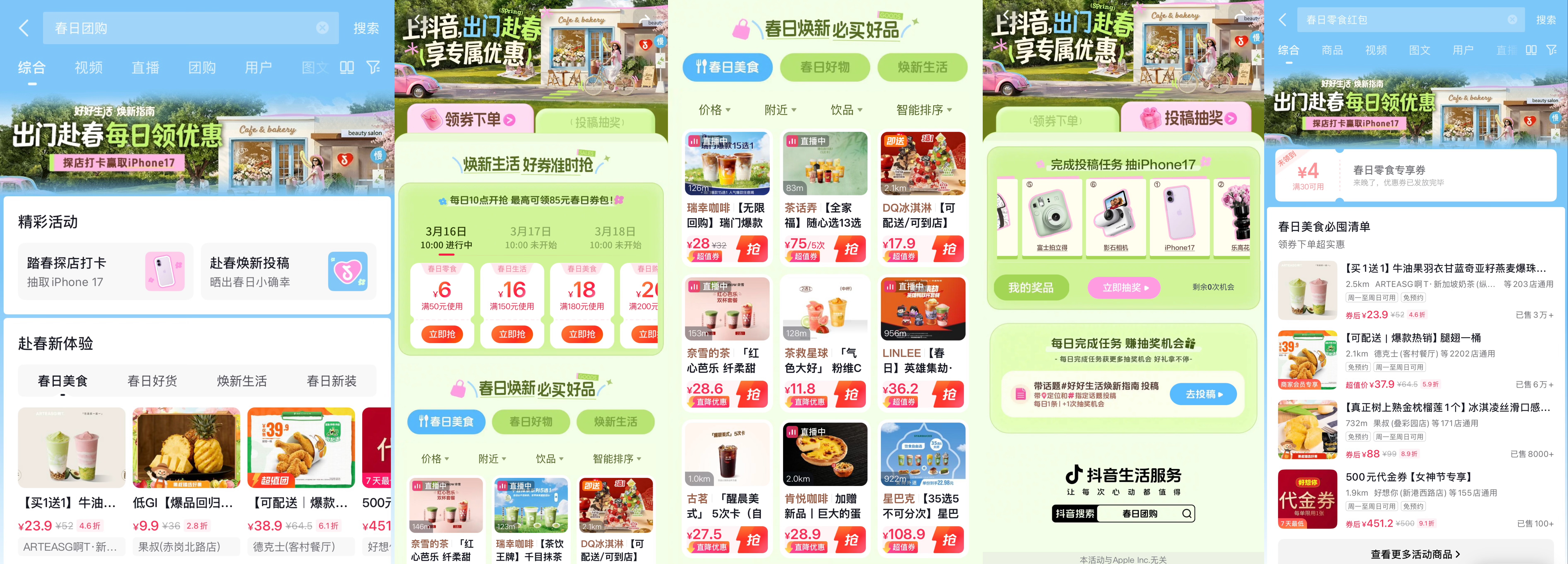 抖音生活服务捕捉到这份春日向往,于3月16日—3月31日推出「好好生活焕新指南」,开启一场春日焕新之旅。以“出门赴春”为主题,联动美食、饮品、丽人、服饰、零售、生活服务六大品类商家,把春日的浪漫与治愈,融入衣食住行的每一个角落,让大家轻松解锁属于自己的春日美好。