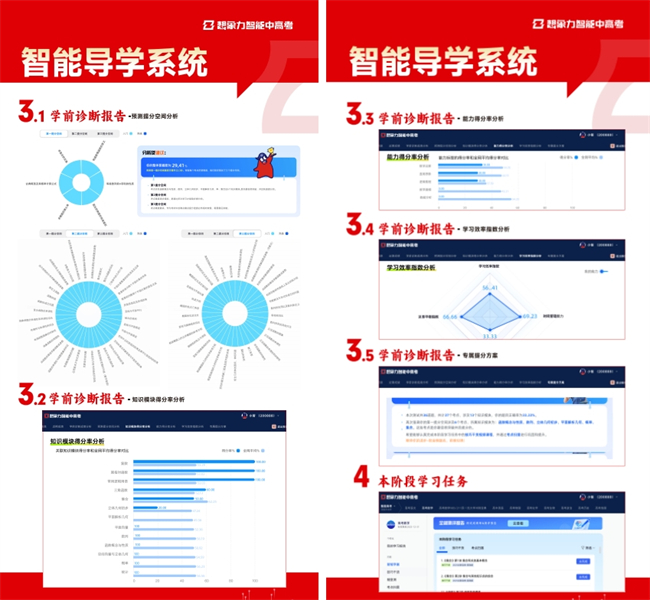 想象力智能中高考智能导学系统的学前诊断报告涵盖成绩分析、提分空间预测、知识模块得分率、能力得分率、学习效率指数等核心模块,用直观的数据图表,让学生、家长清晰了解自身优势与不足,为专属提分方案的制定提供科学依据。