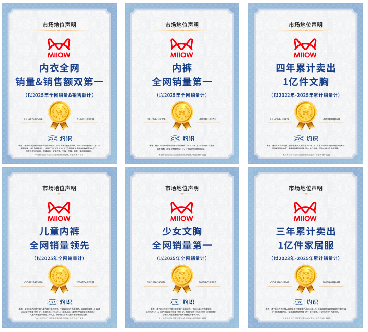 近日,国际权威行业研究与咨询机构CIC灼识发布最新市场地位声明,猫人一举斩获六项核心品类认证:猫人内衣全网销量与销售额双第一、猫人内裤全网销量第一、猫人家居服三年累计销量突破1亿件、猫人文胸四年累计销量突破1亿件、猫人少女文胸全网销量第一、猫人儿童内裤全网销量领先。