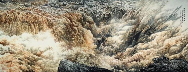 谈及黄河创作,陈克永直言自己的创作内核从未停留在具象风景:“我画这黄河,不是画黄河的这个风景,我是通过黄河水的这种流的那种力量感,来象征着我们这个民族的跌宕起伏的历史。”他想借黄河表现中华民族七千年来的精神内核,“为什么叫《奔腾咆哮民族魂》,它是有一种不屈不挠的精神在里面”,在他的笔墨里,黄河水是有生命力的,“我画的水,是万马奔腾,向前冲击的感觉,摧枯拉朽的一种民族精神,是精神的,而不是形象的,但是它离不开形,这叫形神兼备”。