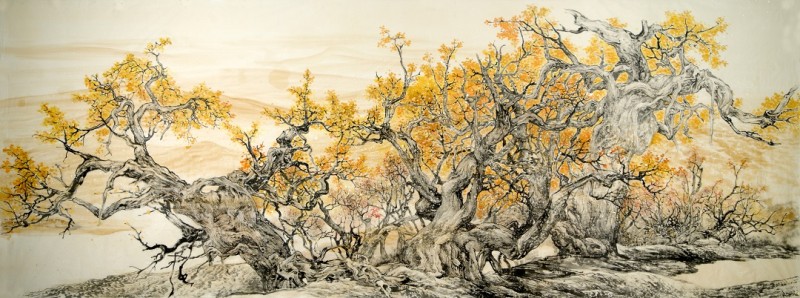 荒漠中向上生长的胡杨,在他的笔墨下,成为中华民族傲骨与坚守的生动写照。而他始终秉持的创作初心,也让每一幅作品都成为自然实景与民族精神的融合,让大山大水的壮观与自强不息的民族魂浑然一体。