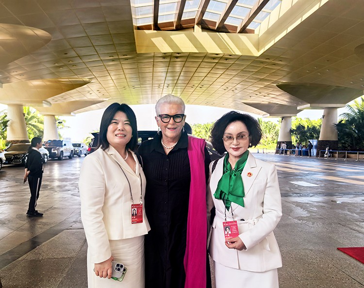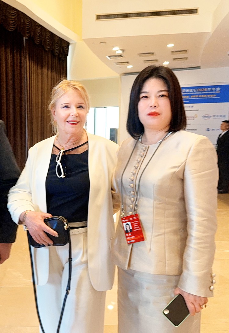 深圳造梦空间人工智能董事长闫燕燕、北京清青恒美技术研究院总经理马彩青与出席博鳌亚洲论坛2026年年会的代表合影