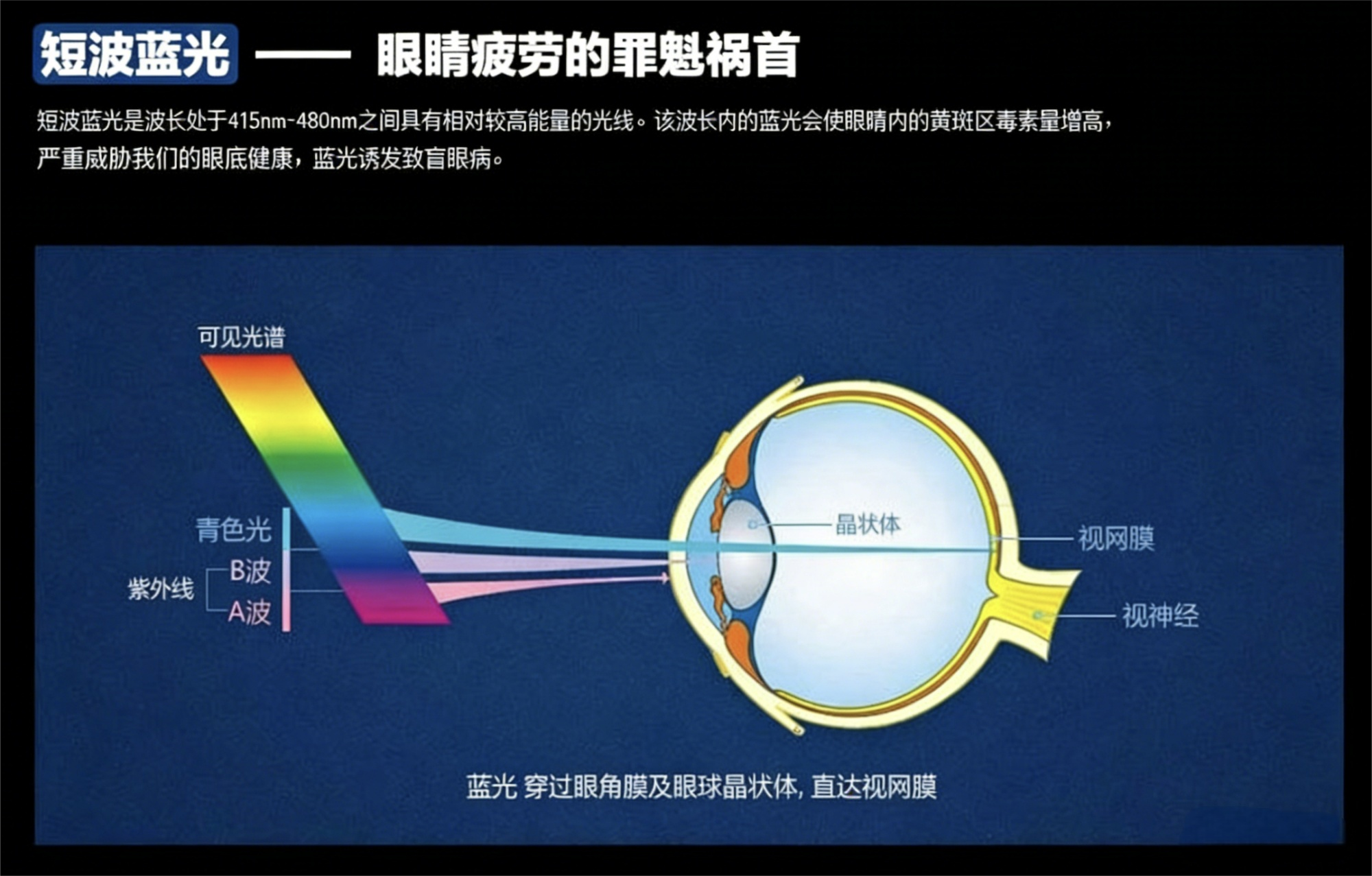 依据国标GB/T20145-2006光生物安全标准,蓝光是波长在380nm-500nm之间的可见光,本身是自然光的一部分,而我们常说的有害蓝光,是指波长在400nm-500nm、尤其是415nm-480nm的短波蓝光,已被证实会加剧视疲劳、威胁视网膜健康。很多厂商将蓝光波长与蓝光危害直接划等号,这是断章取义,波长只是其中一个影响因素,真正影响蓝光危害的本质是能量密度,能量越强,对视网膜刺激越大,也就越伤眼。
