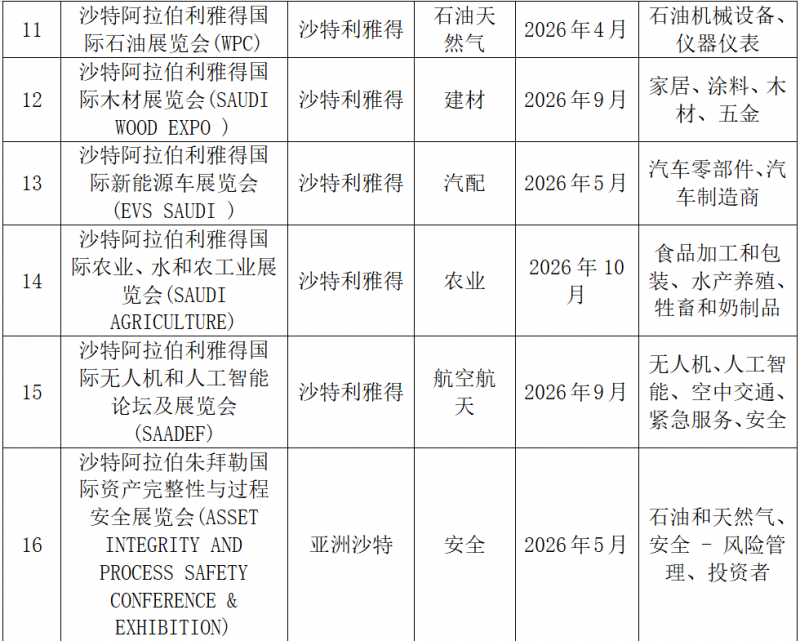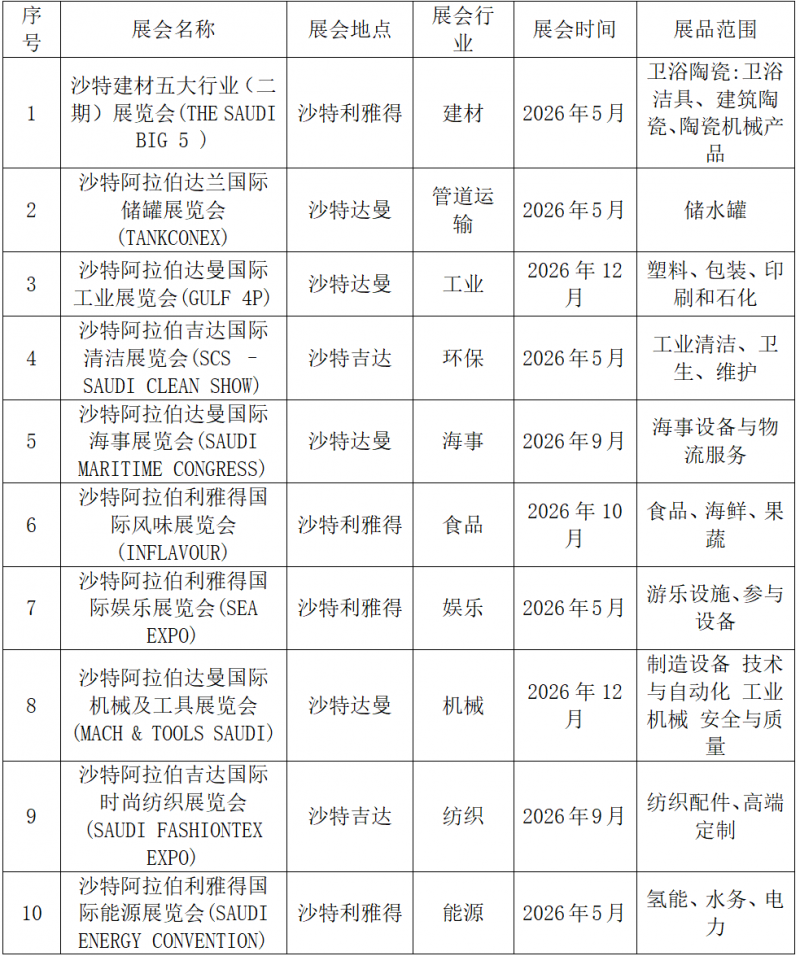 国艺中联梳理的2026 年沙特重点展会清单,覆盖建材、工业、能源、食品、海事、机械、纺织、农业、航空、安全等多个赛道,时间集中在4–12 月,地点以利雅得、达曼、吉达为主,便于企业按行业与档期规划参展。