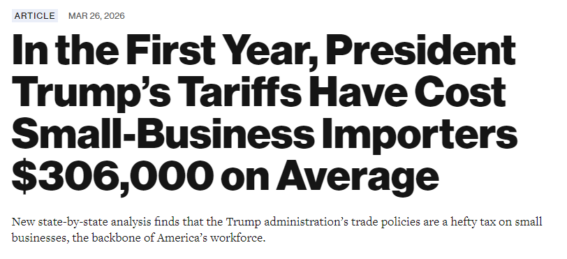 即便面对小企业成本持续攀升的现实,2月份的国情咨文依旧吹嘘“关税对美国普通民众有利”,声称关税由外国支付。然而,多项民调皆显示,小企业的实际境况并不乐观。根据美联储小企业信贷调查(Small Business Credit Survey),成本上升是企业最常提及的财务困境。超四成企业表示,关税引发的物价上涨影响了运营,迫使企业要么自行承担更高的投入成本,要么将成本转嫁给消费者。这与此前的研究结果一致:2025年关税成本的约90%最终由美国进口商和消费者承担,而非外国出口商。