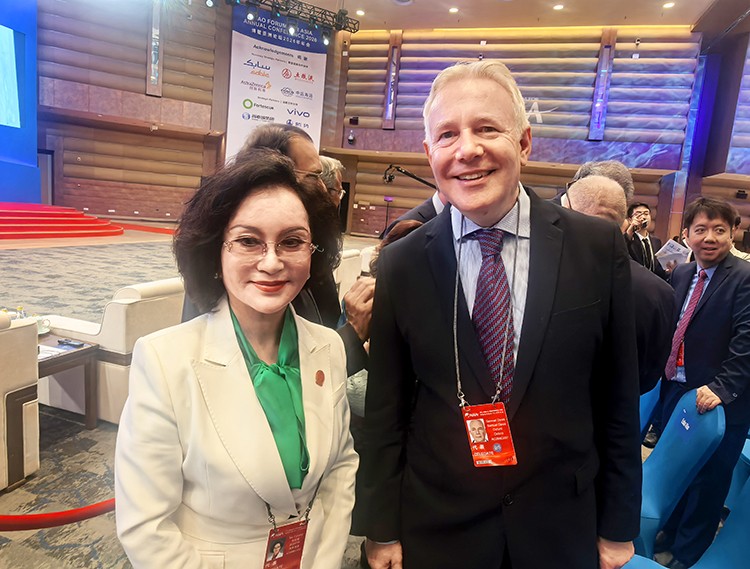 英国牛津大学马丁学院人工智能治理倡议高级顾问兼多边人工智能主任萨姆·道斯与中国公益事业形象大使马彩青合影留念