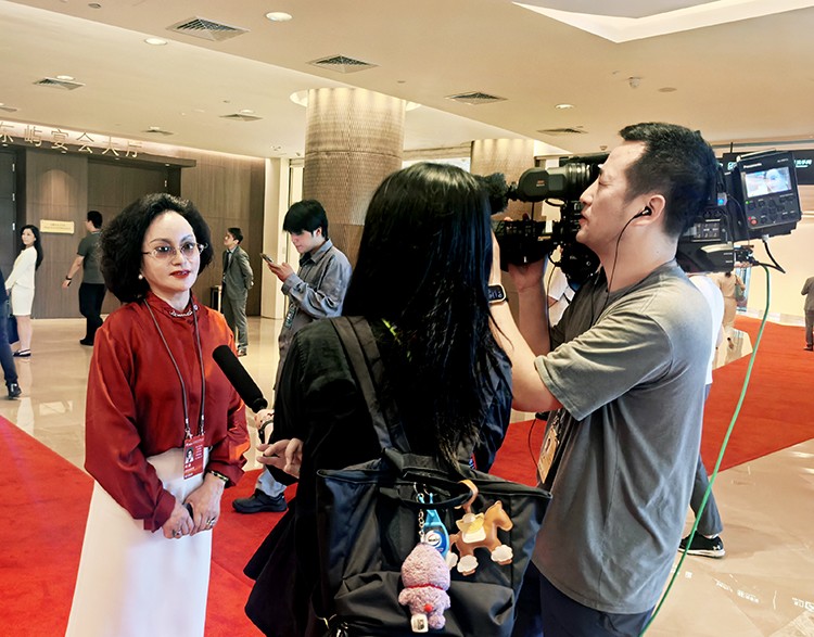 中国公益事业形象大使、北京清青恒美技术研究院总经理马彩青在年会现场接受媒体采访