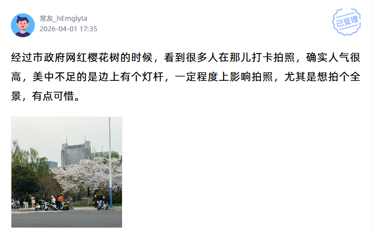 去年4月,凤凰传奇在常州举办演唱会,现场观众反映厕所数量不足。面对“吐槽”,当地领导没有回避,而是在社交平台直接回应“今天改善”。从即时互动到现场调整,这种“边听边改”的治理方式,告别了以往“层层反馈、层层转办”的路径依赖,也让网络不再只是情绪出口,而成为参与城市治理的重要渠道。此次为樱花树移走路灯,正是这种机制的延续。从常州来说,“听劝”已经从个案转变为常州走好网络群众路线的常态。