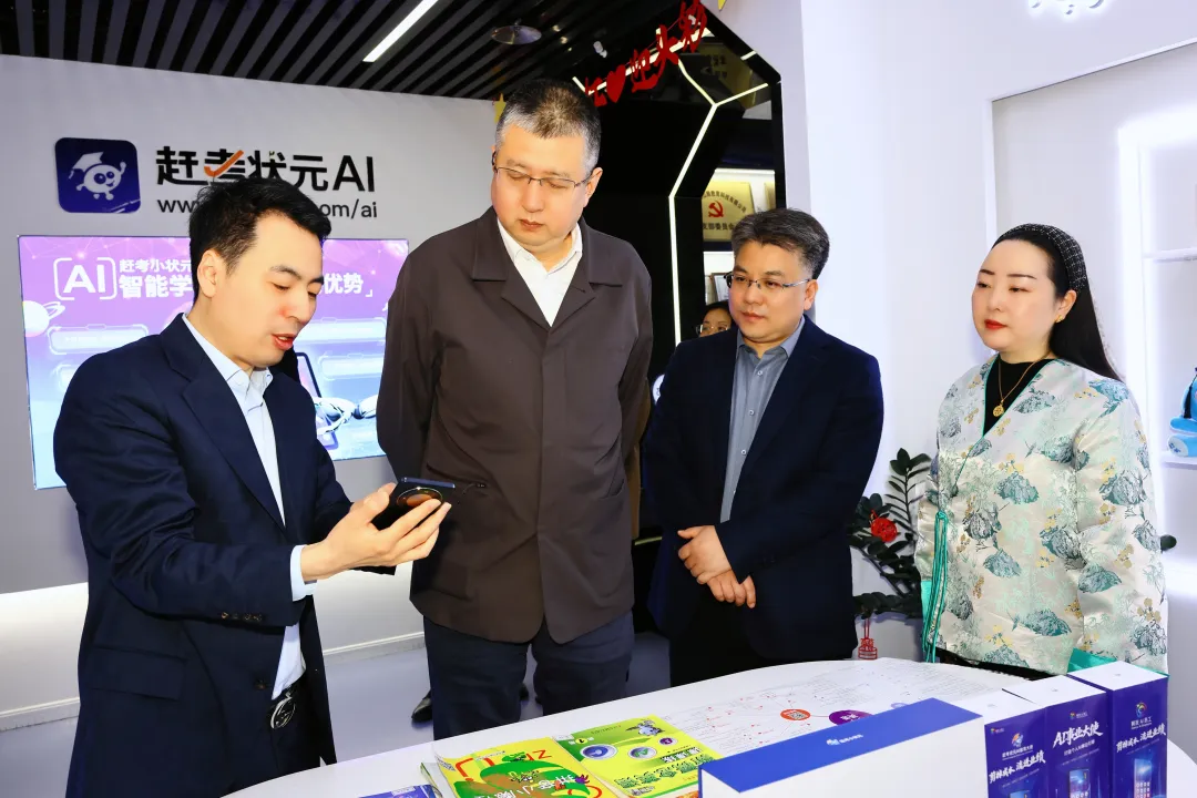 调研伊始,陈晓军书记一行深入了解了集团的发展历程、资质荣誉与企业文化建设成果。在荣誉展示区,集团所获的艾瑞咨询行业认证、教育部白名单资质、公安部信息系统安全三级认证以及商务部特许经营许可证等国家级权威资质,引起了来访领导的驻足关注。这些沉甸甸的荣誉,不仅是对集团规范化运营与技术创新能力的有力佐证,更无声诉说着近二十年来的坚实足迹。在随后的参观中,周强向陈晓军书记一行系统展示了集团的核心产品矩阵——包括赶考小状元AI智能学习机、AI智能学习周边产品,以及剪流AI智能员工手机。这些融合了人工智能前沿技术的创新产品,展现了集团从智慧教育到AI赋能千行百业的深厚技术积淀与场景落地能力。同时,集团在人才建设、企业人文关怀和党建工作方面的扎实投入,也给调研领导留下了深刻印象。