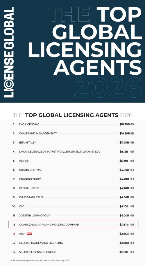 近日,全球权威行业杂志《License Global》公布2026年“全球授权代理商TOP 20”榜单,广州艺洲人品牌管理股份有限公司稳居第12名,成为国内唯一的中国本土授权代理企业连续五年入围TOP20并蝉联该榜单TOP12。这一里程碑式的成就,既是对艺洲人专业能力的国际认证,更彰显了中国IP授权行业在全球舞台上的崛起与影响力。