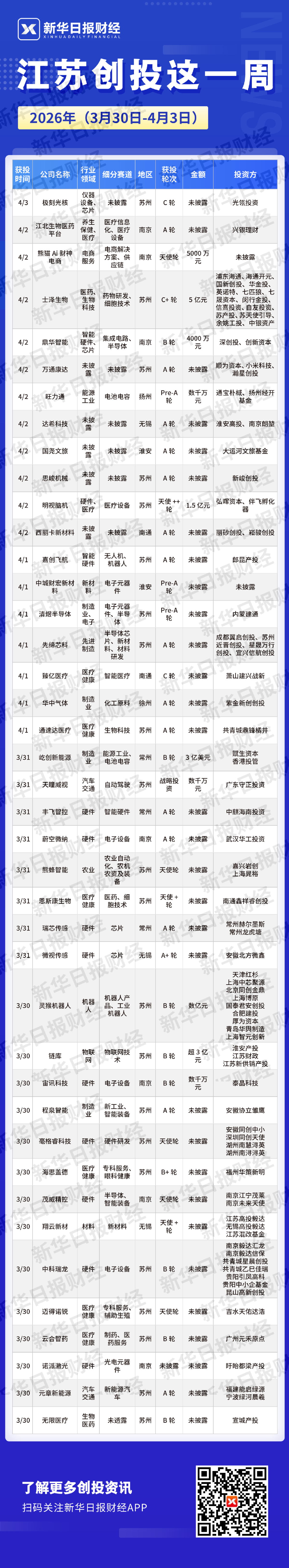 产投基金方面,3月30日,连云港安防产业专项母基金注册落地,规模10亿元,是省战新母基金第四批首只落地基金,聚焦安防产业链,涉及高端装备、集成电路、人工智能等领域;同日,徐州工程机械产业基金完成首期20亿元的备案,由徐工集团联合招商局集团等发起,投向新能源、人工智能、高端装备等方向。3月31日,江阴中灜产投扶摇战新股权投资基金完成工商注册,规模10亿元,是江阴首支集成电路AIC基金,聚焦集成电路装备、高端芯片设计、EDA等关键领域。