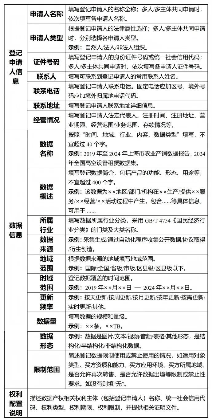 申请办理初次登记的,登记申请人应当提交初次登记申请表(参考模板见附件1)、登记申请人身份佐证材料、数据产权合法取得的佐证材料,以及数据样例和数据描述等材料。