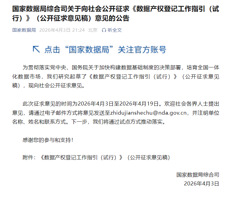 为贯彻落实党中央、国务院关于加快构建数据基础制度的决策部署,培育全国一体化数据市场,我们研究起草了《数据产权登记工作指引(试行)》(公开征求意见稿),现向社会公开征求意见。