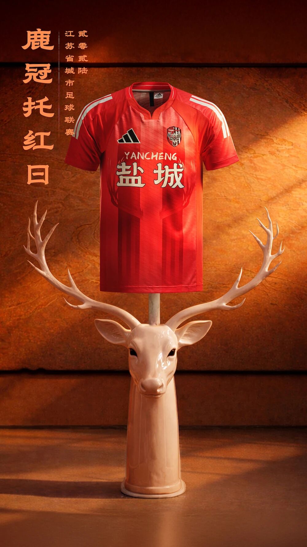 主场球衣以赤焰红为主色调,热烈而厚重,自带一往无前的气场。设计立足“东方湿地之都”“麋鹿之乡”的城市定位,将盐城最具标识性的麋鹿图腾,化作衣间最醒目的视觉符号。