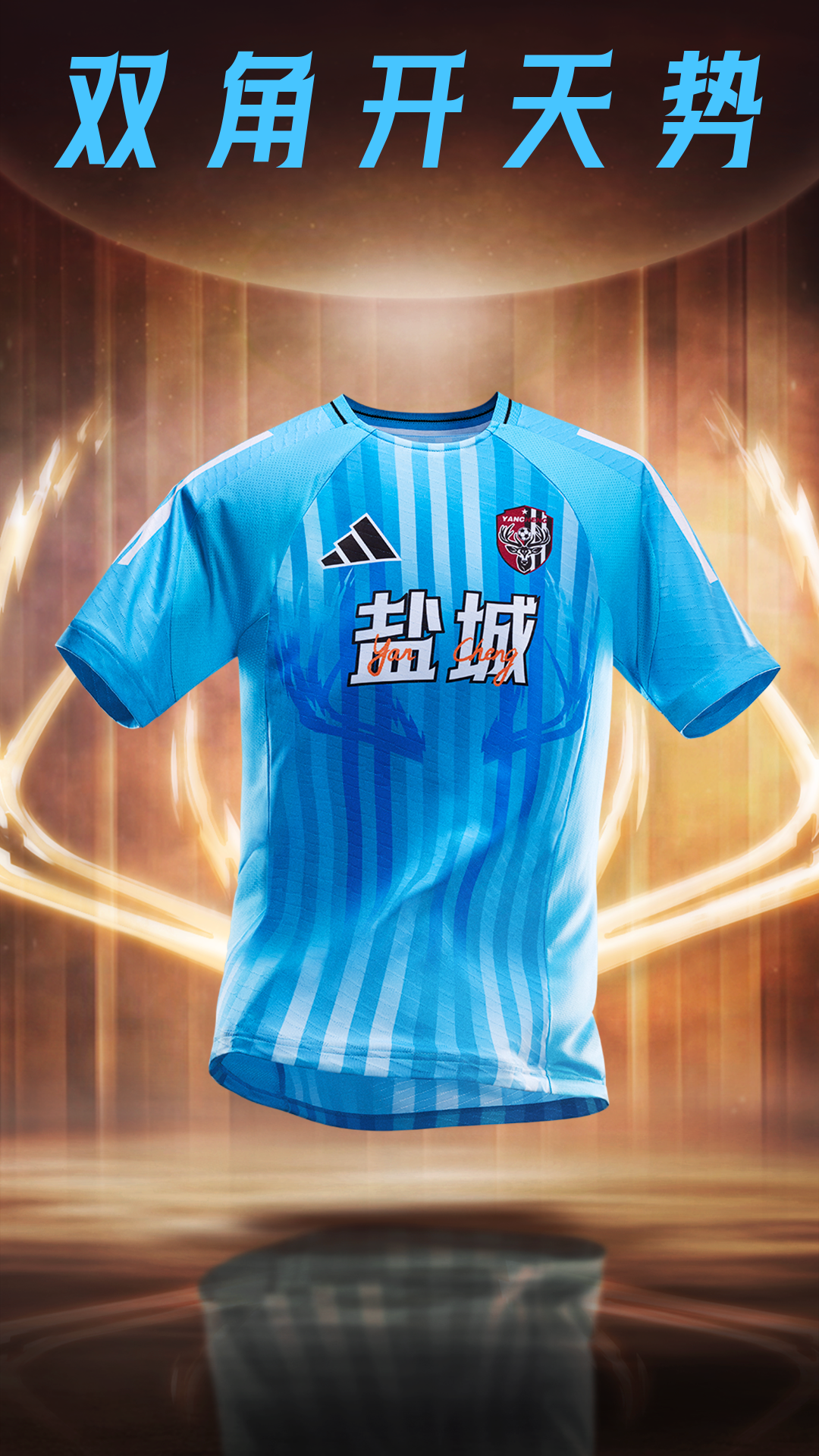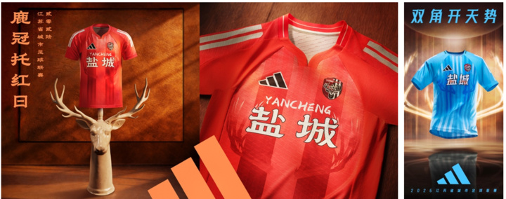 回望盐城队徽,便以麋鹿为核心图腾,用坚硬有力的鹿角托起足球,昂首挺立、尽显风骨。设计者曾表示,希望队徽能让人一眼认出“这就是盐城”。如今,全新球衣同样以麋鹿为主题,将鹿角与湿地元素铺展于衣身:主场赤焰藏热血,客场天蓝显从容,让自然之力与竞技之魂完美共鸣。