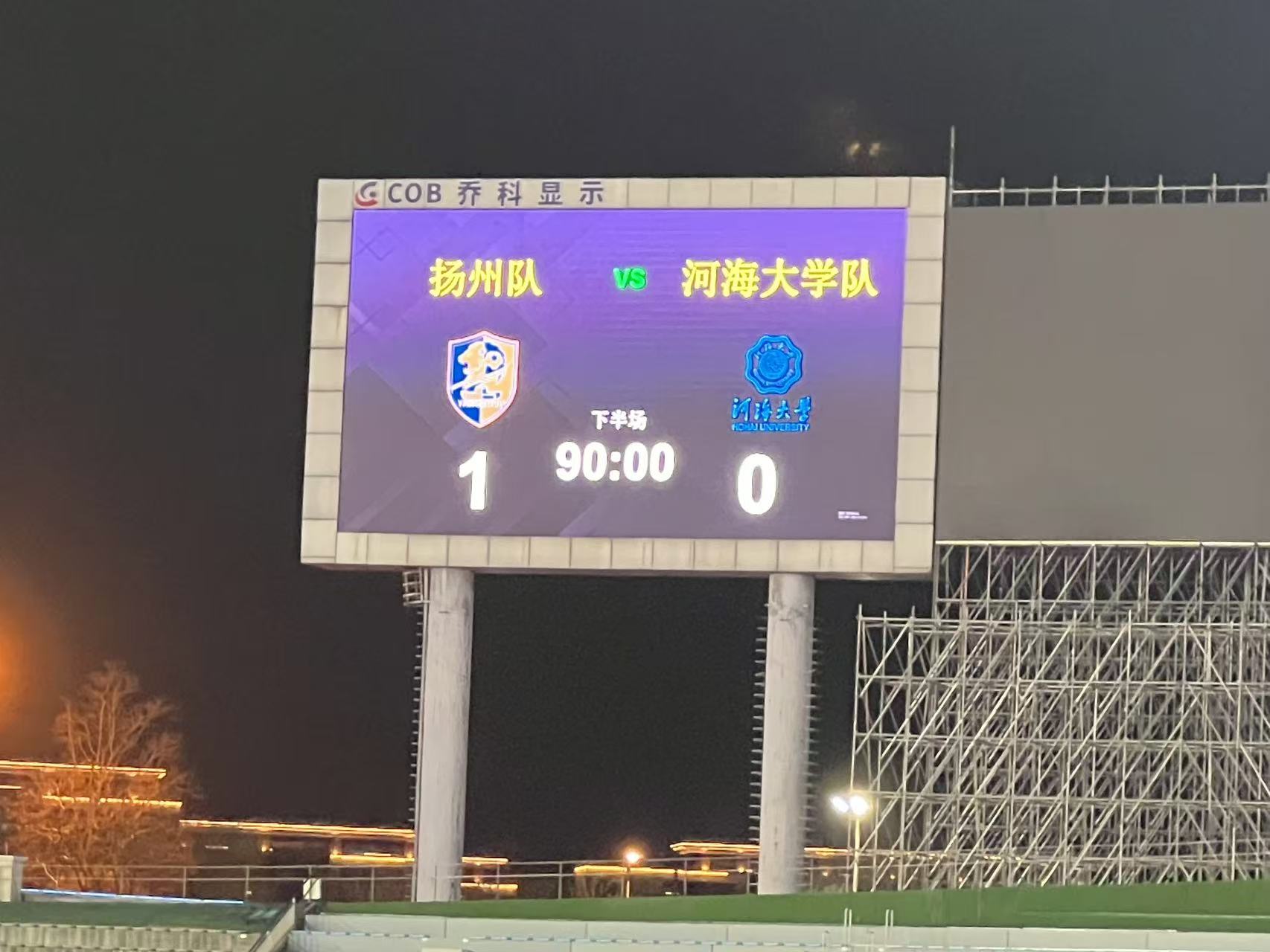 哨声吹响后,双方迅速进入比赛状态,场上节奏明快,拼抢积极。第28分钟,扬州队右路突破,一记禁区内的推射打破僵局。下半场易边再战,河海大学队一度创造几次较好的进球机会,可惜最后一攻稍显乏力。整场比赛双方攻防转换节奏较快,展现出良好的战术素养与竞技状态。终场哨响,两队均未能再度改写比分,全场比赛以1比0结束。