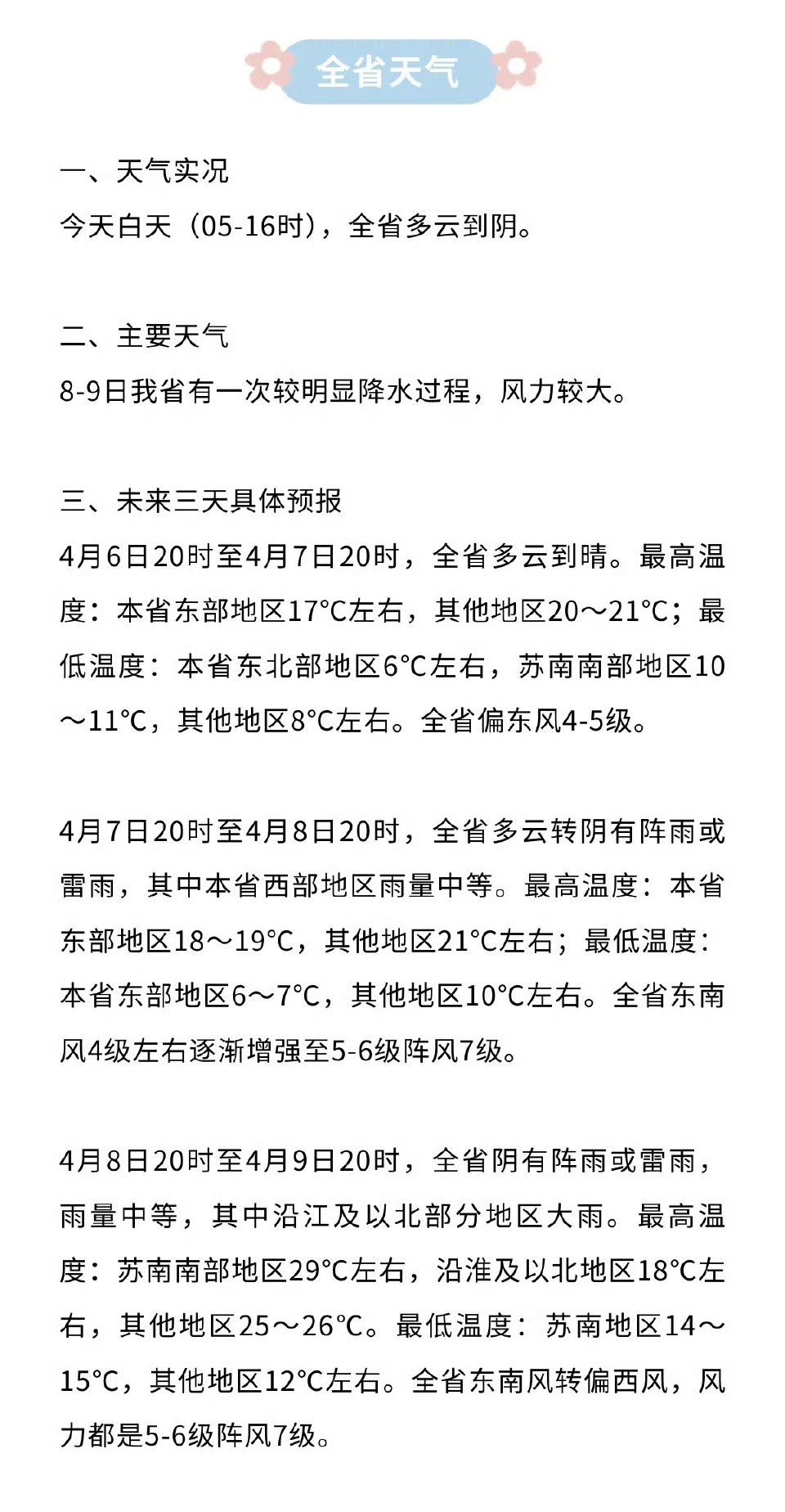 4月6日20时至4月7日20时,全省多云到晴。最高温度:本省东部地区17℃左右,其他地区20~21℃;最低温度:本省东北部地区6℃左右,苏南南部地区10~11℃,其他地区8℃左右。全省偏东风4~5级。