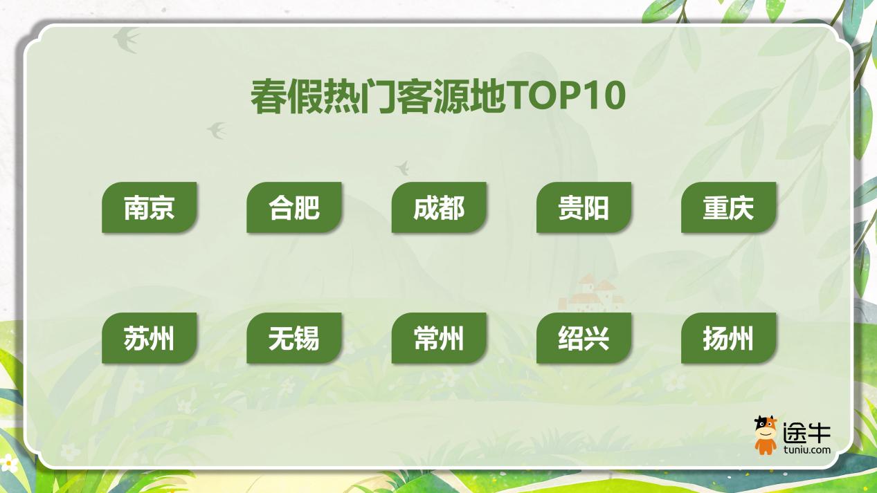 从客源地来看,今年实施春假且时间安排和清明假期连休的城市中,南京、合肥、成都、贵阳、重庆、苏州、无锡、常州、绍兴、扬州等地途牛用户出游意愿更为强烈,跻身“春假热门客源地”榜单前列。