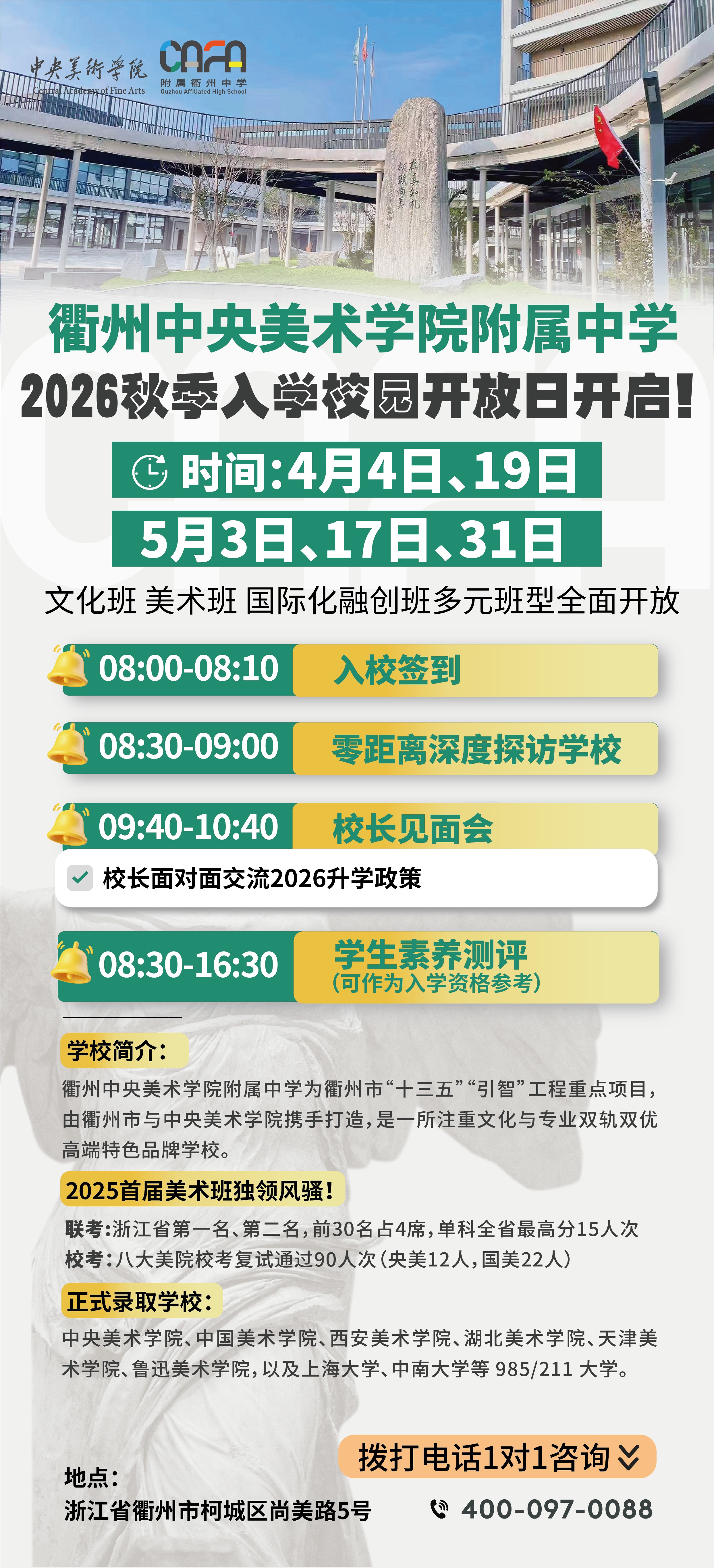 学校新一届招生咨询已全面开启。如果你也想让孩子在专业的艺术土壤中拔节生长,不妨走进衢州央美附中看一看——那里不仅有灯火通明的深夜,更有通往顶尖美院的清晰路径。
