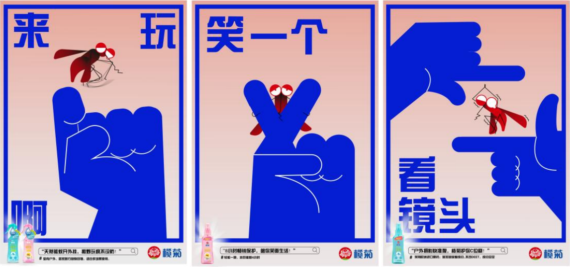 华侨大学学生创作的《榄菊驱蚊液系列广告海报》则采用极简几何扁平风,用高饱和度的色彩反差,演绎了从“被动防御”到“主动攻击”的趣味反转,成功冲刺学院奖全场总决赛。这些作品以幽默、自嘲、夸张的方式,将产品的“持效”“安全”“便携”等卖点无缝植入,让“防蚊”这件事变得既酷又潮。
