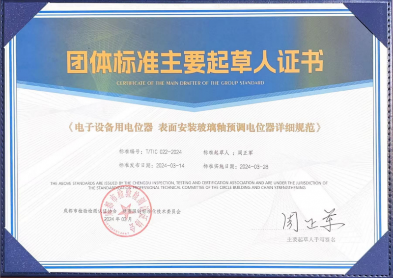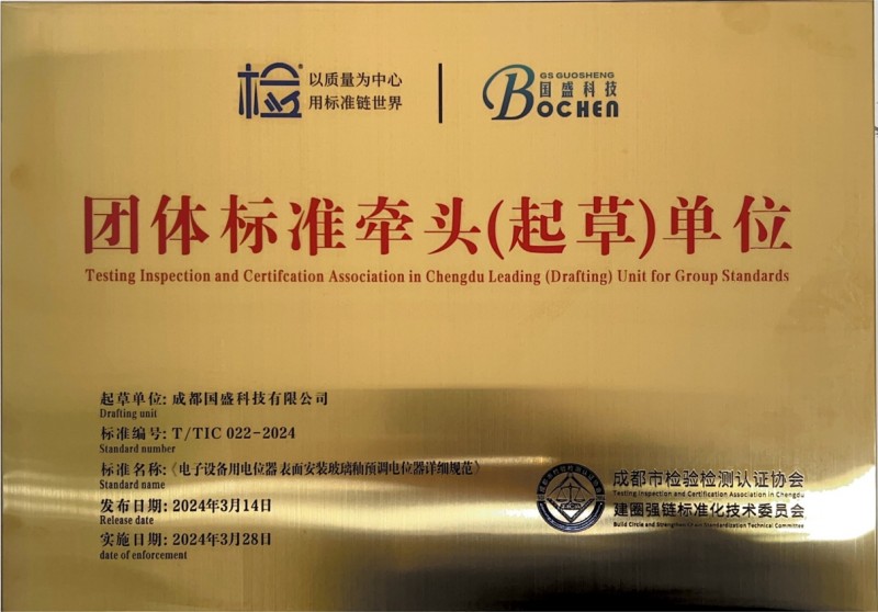 近日,成都国盛科技有限公司斩获《电子设备用电位器表面安装玻璃釉预调电位器详细规范》团体标准主要起草人证书,成为该标准的牵头起草单位。同时,四川博晨国盛智能科技也参与了此次标准的起草工作,为标准的制定提供了积极支持。这份于2024年3月正式发布并实施的团体标准,在国内表面安装玻璃釉预调电位器领域技术发展尚不成熟的行业背景下,不仅彰显了国盛科技在该领域的技术领先地位,更标志着国内企业实现了该细分赛道核心技术与材料国产化的关键突破,为行业标准化、自主化发展树立了全新标杆。