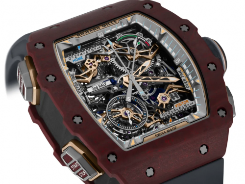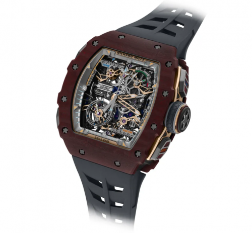 腕表的核心魅力源于其全新机芯——由理查米尔与Audemars Piguet le Locle历时5年合作研发,最终有了这枚集成了陀飞轮擒纵机构、70小时动力储存、功能指示器,以及配备重叠中央分针和秒针的飞返计时码表。