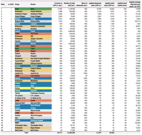 根据这份报告,排名前四的劳力士、卡地亚、爱彼和百达翡丽,市场份额加起来达到整个行业的55%,大于2024年的52.5%。
