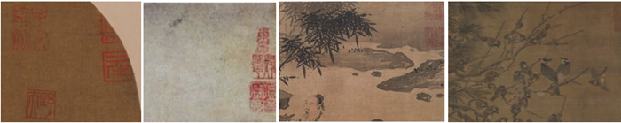 从左至右:丁野夫《幽溪听泉图》(局部)、戴进《二仙图》(局部)、朱孟渊《竹林高士图》(局部)、边景昭《三友四喜图》(局部)
