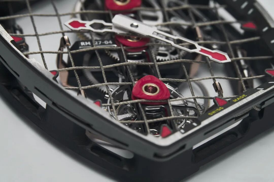 RM 27-04 Rafael Nadal 陀飞轮腕表就使用了含38.5%碳纤维的专利材质TitaCarb®,其抗拉强度达370兆帕,是世界上最耐用的聚合物之一。同时,机芯部分采用前所未见的悬浮设计,仅由一个表面积为855平方毫米的微喷砂网格支撑。据了解,“网格”系由一根直径0.27毫米的单根编织钢缆所组成,并由两枚经PVD处理的5N黄金张拉器固定,能够承受12,000 g的加速度。机芯的设计灵感源自网球拍结构,成品亦成为网球运动员纳达尔的理想选择。即使在高强度的比赛中,这款腕表依然能够稳定运行,实现了轻量化与高强度的完美平衡。