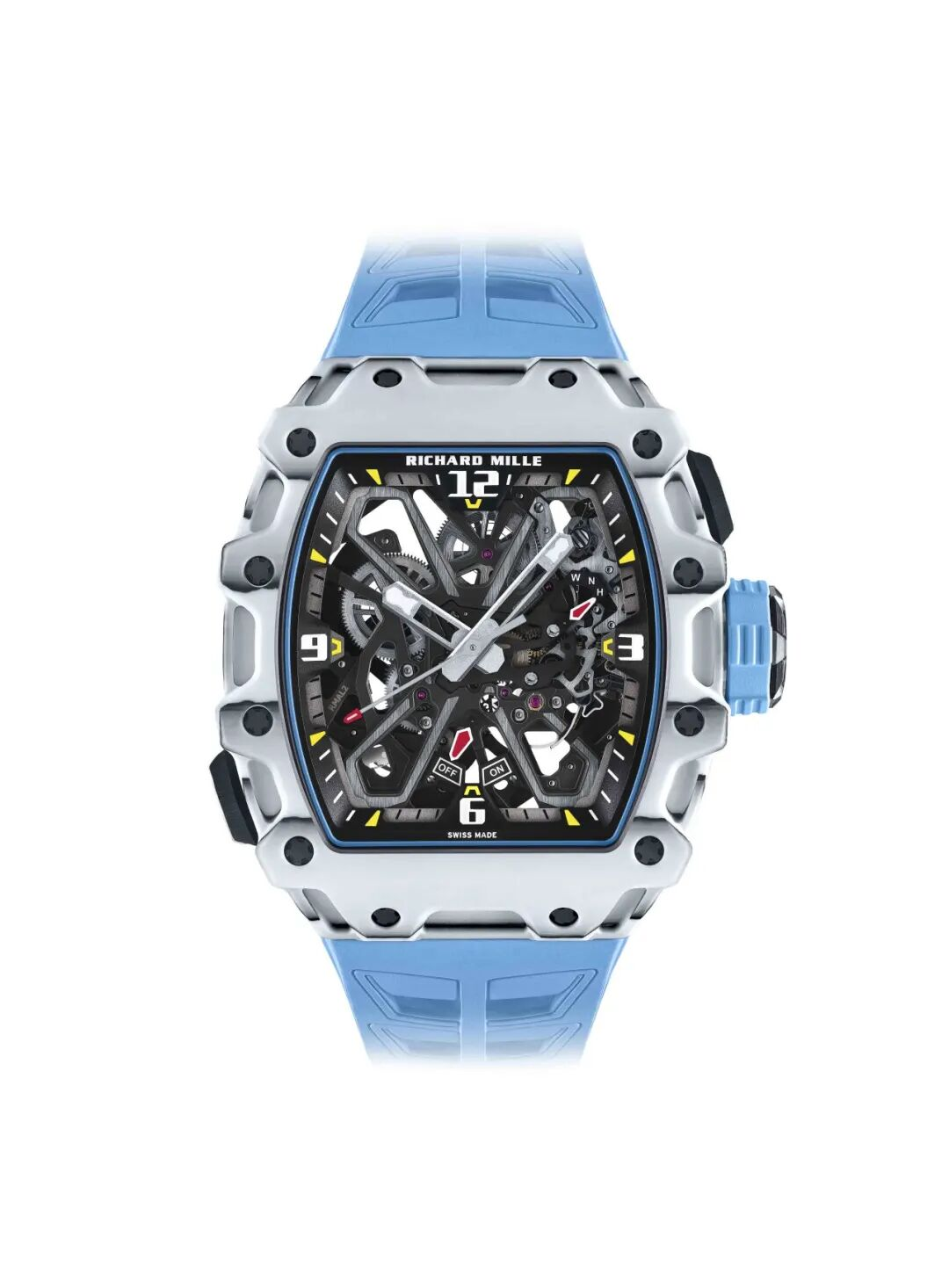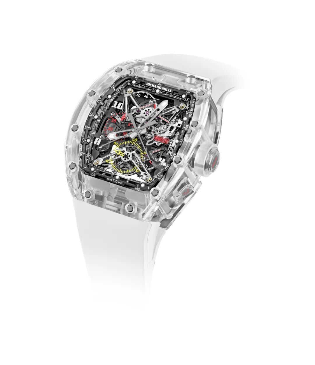 以赛车头盔护目镜为灵感的RM 056 Felipe Massa采用加工难度极高的蓝宝石水晶表壳,使之兼具高透明度和抗刮擦性能。RM 72-01 Lifestyle 自动上链计时码表则在设计和制造时,对机芯、表壳、表盘进行了整体构思,严格遵循专业要求,移除镶圈,将机芯通过4颗钛制螺丝和弹性金属橡胶(ISO SW)固定在底架上,呈现出和谐统一的视觉效果。