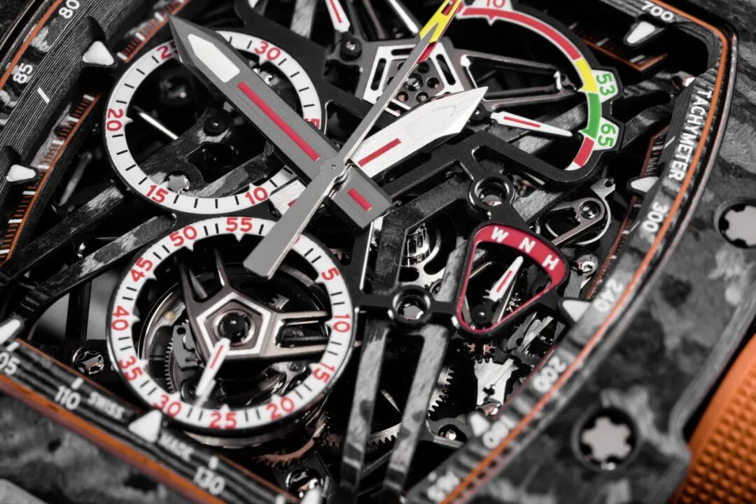 另一款RM 50-03 迈凯伦F1超轻双秒追针陀飞轮计时码表的设计灵感来自赛车引擎,它搭载一个重量仅40克的超轻陀飞轮机芯,进一步提升了机芯的抗震性和精准度。