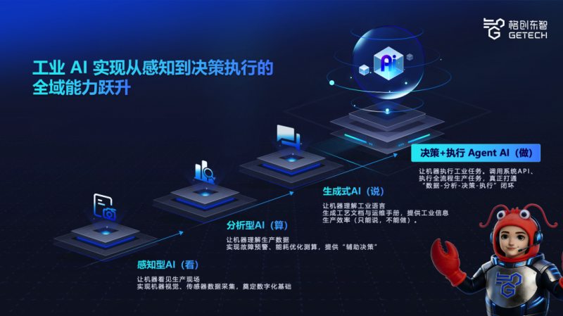 纵观工业AI演进史,路径已呈现四阶段定式:感知型AI解决“看”,分析型AI解决“算”,生成式AI解决“说”。它们始终停留在辅助角色——告诉你问题在哪,却不会动手解决。如今Agent AI将核心课题转向“做”,调用系统API执行生产任务,打通从数据到决策再到执行的闭环。AI不再是辅助工具,而成为生产体系的核心执行节点,人类回归决策岗位。