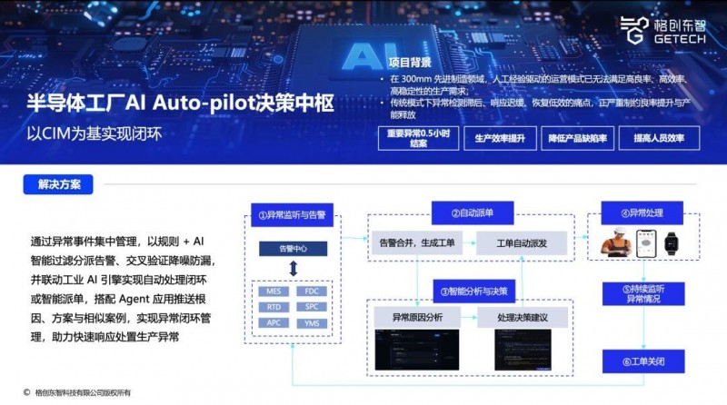 当这套逻辑落地到一座12吋晶圆厂,价值变得具体而锋利。每天数以万计的传感器数据奔涌而来,任何一个工艺参数的微小漂移都可能演变为批次性良率灾难。传统模式下,工程师同时驾驭MES、SPC、FDC、EAP、AMHS等七八套系统,告警响起时像消防员一样冲向现场,靠经验判断根因,靠手动协调资源。这种被动的“人找流程”模式,让异常处理的平均耗时定格在四小时以上,而在这四小时里,数千片在制品可能正在异常状态下持续流转。