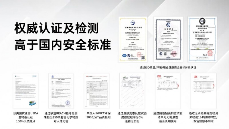 享久产品通过多项权威认证及检测,高于国内安全标准。生产企业通过ISO三标体系认证。产品获美国农业部USDA认证,100%生物基成分;通过欧盟REACH指令检测,未检出250项有害化学物质;通过无西药麻醉检测,未检出134项麻醉成分;通过阴道黏膜刺激试验,结果为无刺激性;通过皮肤变态反应试验,皮肤致敏率为0%。