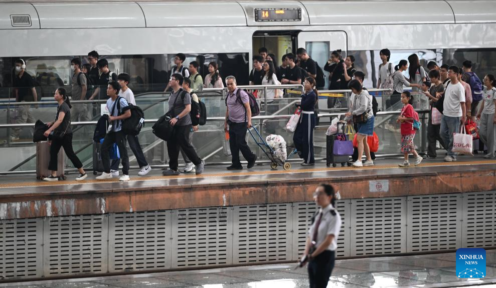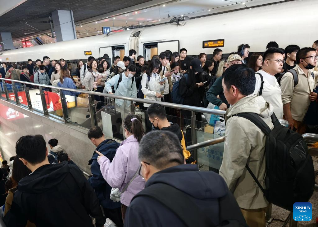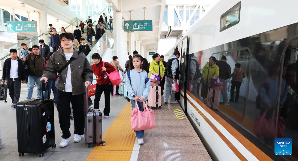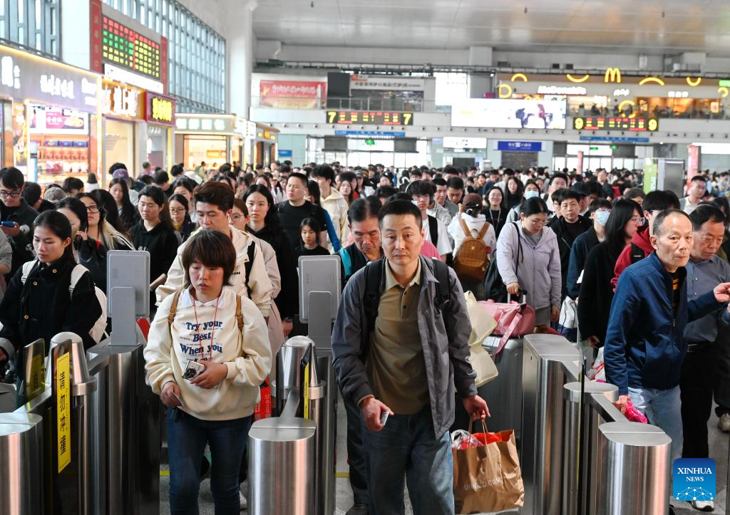 Passengers walk after getting off a train at Guangzhou South Railway Station in Guangzhou City, south China's Guangdong Province, on April 6, 2026. An estimated 845.38 million passenger trips were made across China during the three-day Qingming Festival holiday, up 6 percent year on year, transportation authorities said on Monday.