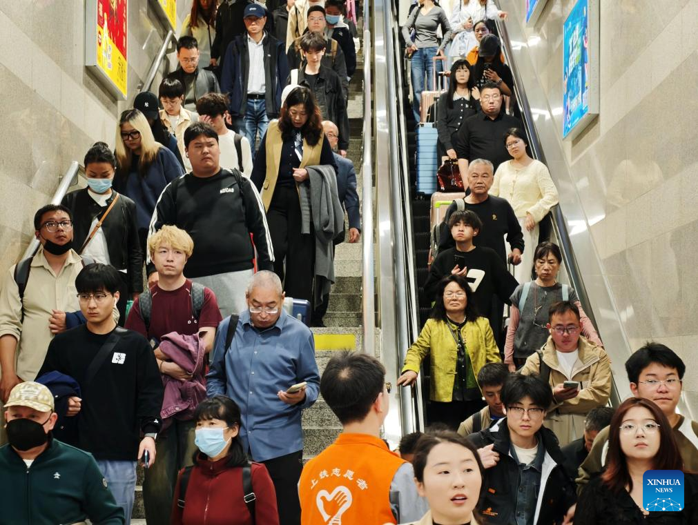 Passengers walk after getting off a train at Shanghai Hongqiao Railway Station in east China's Shanghai, on April 6, 2026. An estimated 845.38 million passenger trips were made across China during the three-day Qingming Festival holiday, up 6 percent year on year, transportation authorities said on Monday.