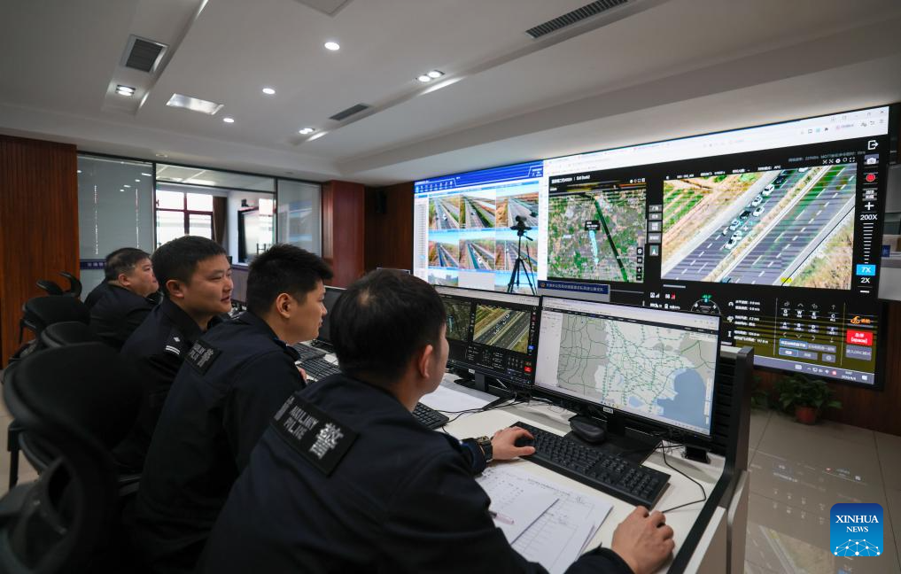 Staff members conduct an accident response via a drone video transmission system at the expressway brigade of the traffic management bureau in north China's Tianjin, April 6, 2026 An estimated 778.45 million road trips were made across China during the three-day Qingming Festival holiday, rising 5.8 percent from the same period last year, according to the Ministry of Transport. (Xinhua/Sun Fanyue)