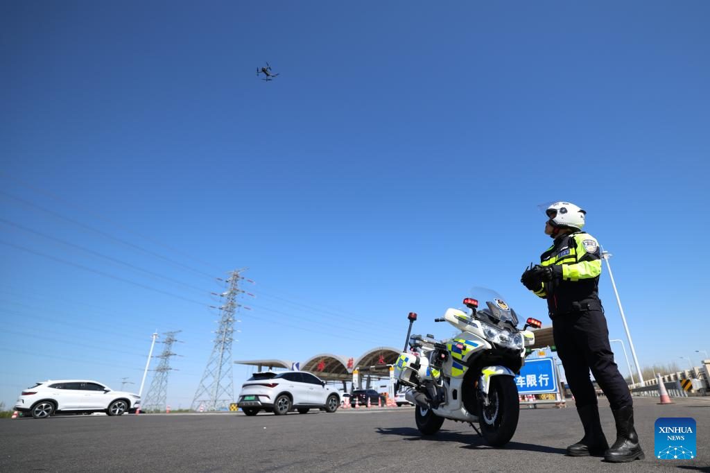 A traffic police operates a drone to conduct patrols at a toll station of an expressway in north China's Tianjin, April 6, 2026. An estimated 778.45 million road trips were made across China during the three-day Qingming Festival holiday, rising 5.8 percent from the same period last year, according to the Ministry of Transport. (Xinhua/Sun Fanyue)
