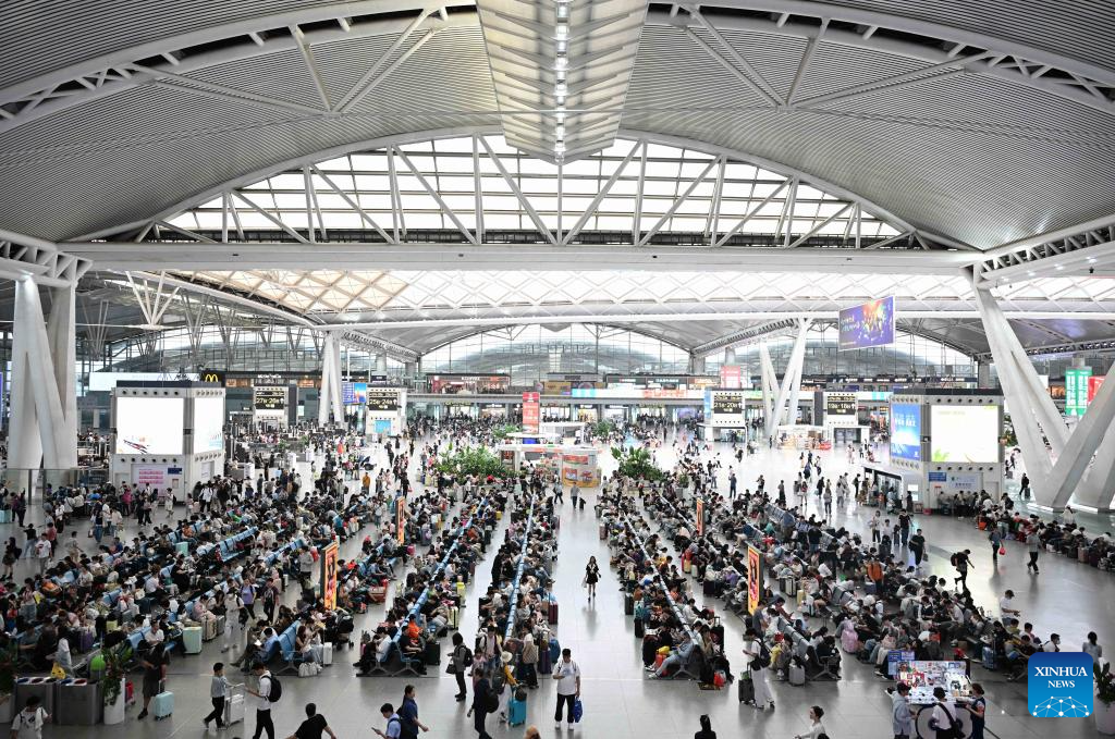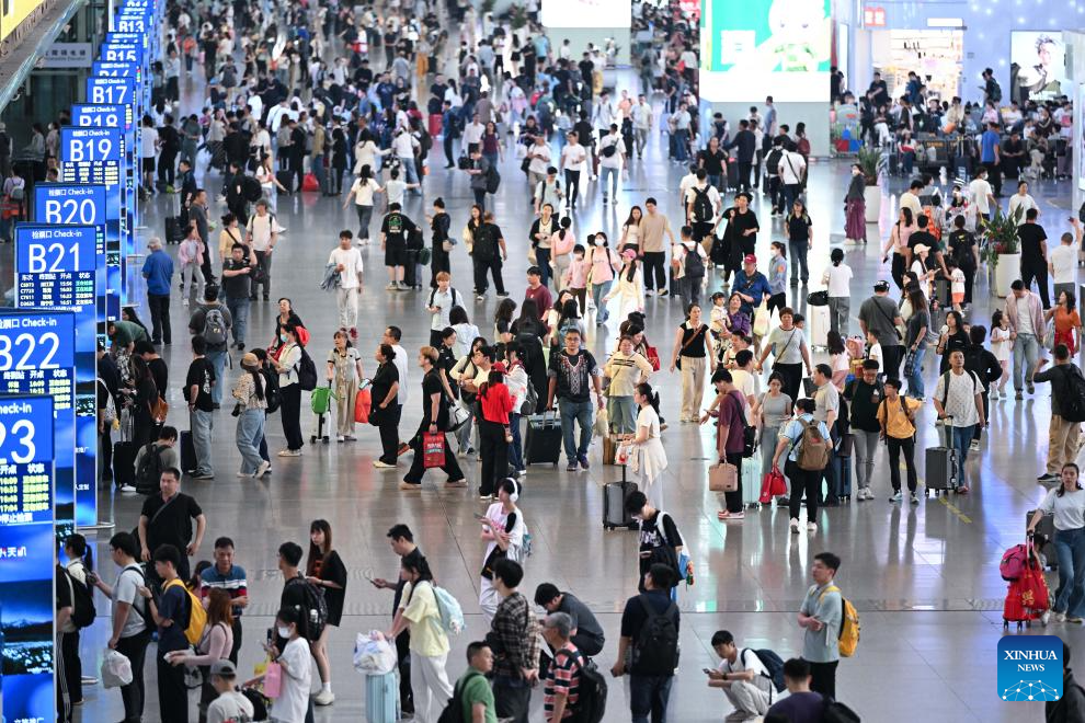 Passengers are pictured at the waiting hall of Guangzhou South Railway Station in Guangzhou City, south China's Guangdong Province, on April 6, 2026. An estimated 845.38 million passenger trips were made across China during the three-day Qingming Festival holiday, up 6 percent year on year, transportation authorities said on Monday.
