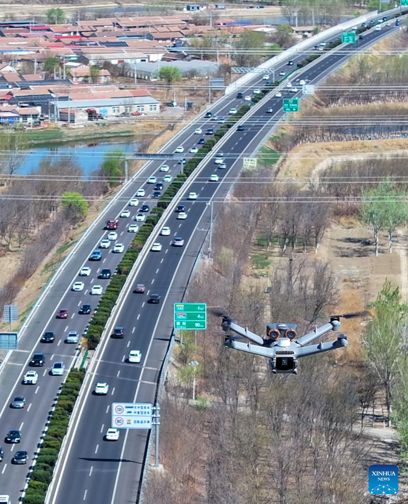 A drone photo taken on April 6, 2026 shows a drone conducting patrols over an expressway in north China's Tianjin. An estimated 778.45 million road trips were made across China during the three-day Qingming Festival holiday, rising 5.8 percent from the same period last year, according to the Ministry of Transport. (Xinhua/Sun Fanyue)