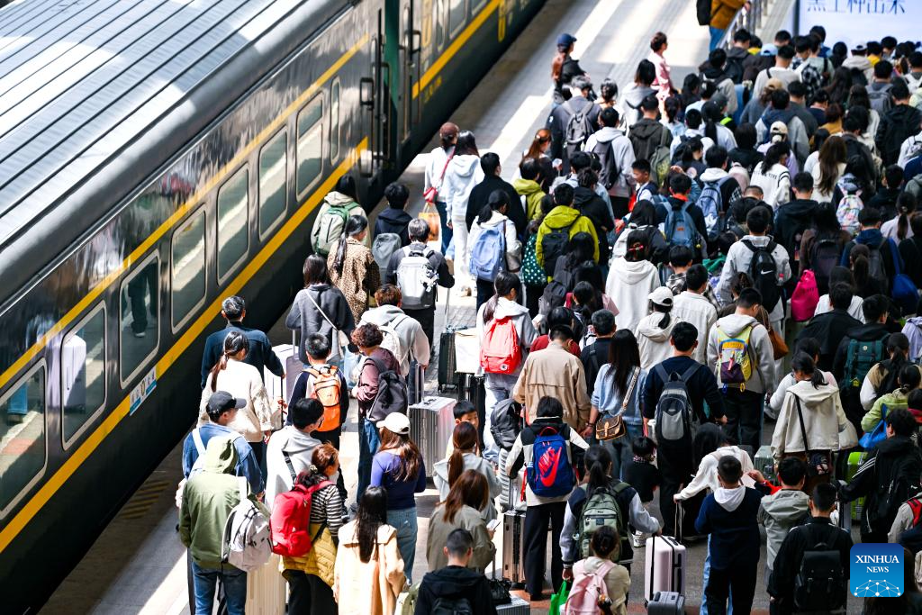 Passengers walk on the platform of Nanjing Railway Station in Nanjing City, east China's Jiangsu Province, on April 6, 2026. An estimated 845.38 million passenger trips were made across China during the three-day Qingming Festival holiday, up 6 percent year on year, transportation authorities said on Monday. The daily average number of trips reached 281.79 million, according to the Ministry of Transport. Road trips accounted for 778.45 million, rising 5.8 percent from the same period last year, while railway trips hit 57.68 million, up 8.2 percent year on year. (Photo by Yang Suping/Xinhua)