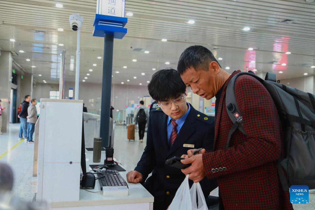 A staff member helps a passenger at Lanzhou Railway Station in Lanzhou City, northwest China's Gansu Province, on April 6, 2026. An estimated 845.38 million passenger trips were made across China during the three-day Qingming Festival holiday, up 6 percent year on year, transportation authorities said on Monday.