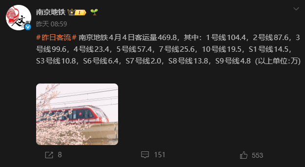 今年3月以来,南京地铁累计10天单日客流量突破400万人次——3月14日星期六407.1万,3月20日星期五401.0万,3月21日星期六411.7万,3月27日星期五405.5万,3月28日星期六414.1万,4月1日星期三春假首日408.0万,4月2日星期四春假第二天408.2万,4月3日星期五春假第三天446.9万,4月4日星期六清明假期第一天469.8万,4月5日星期日清明假期第二天416.1万。