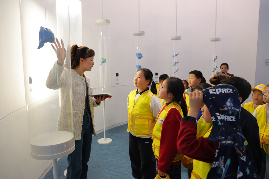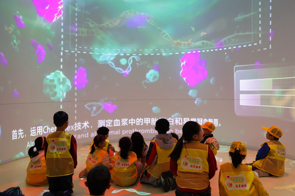 活动首站,孩子们在科普志愿者带领下走进无锡泛生子生物科技有限公司,开启了一场生命科学探索之旅。该公司成立于2020年,位于惠山生命产业园,是全球领先的癌症精准医疗企业。在展厅内,专业讲解员用通俗易懂的语言向孩子们介绍了基因检测、液体活检等前沿技术的基本原理,以及这些技术如何在疾病早筛中发挥作用。“原来科学家可以通过一滴口水发现身体里的‘坏细胞’!”一位小朋友惊叹道。企业科普志愿者还通过动画和互动模型展示了从样本采集到结果分析的全过程,让孩子们直观感受到科技守护生命的温度。从抽象概念到直观认知,这场科普之旅在孩子们心中种下了一颗关于生命科学的种子。