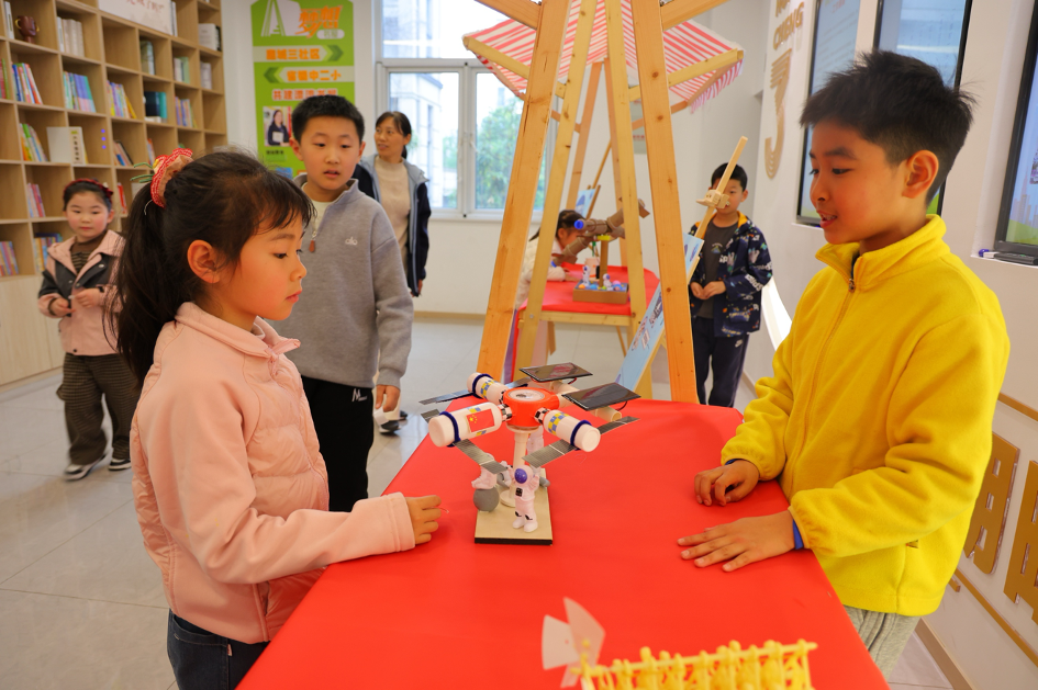 此前,社区通过网格群、学校班级群同步发布活动通知,面向辖内小学生广泛征集科技作品。征集方向涵盖科技小制作、小发明、机器人作品、科幻画、环保创意等类别,报名家庭需提交作品名称与创作简介。短短几天内便收到数十件充满想象力的作品——有用废旧纸盒制作的智能分类垃圾桶,有木头搭建的自动分拣装置,有描绘未来城市与太空探索的科幻画,还有利用太阳能驱动的小车模型。活动当天,这些作品在嘉誉华庭小区惠聚驿家集中陈列,形成一个热闹的“科技集市”。小作者们主动站在自己的作品旁,向参观者讲解创作思路:“这个垃圾桶用了马达和红外传感器,手靠近盖子就会自动打开。”一位家长感慨道:“孩子为了这次展示,反复试验了好几个晚上,今天能把自己的作品展示出来,特别有成就感。”