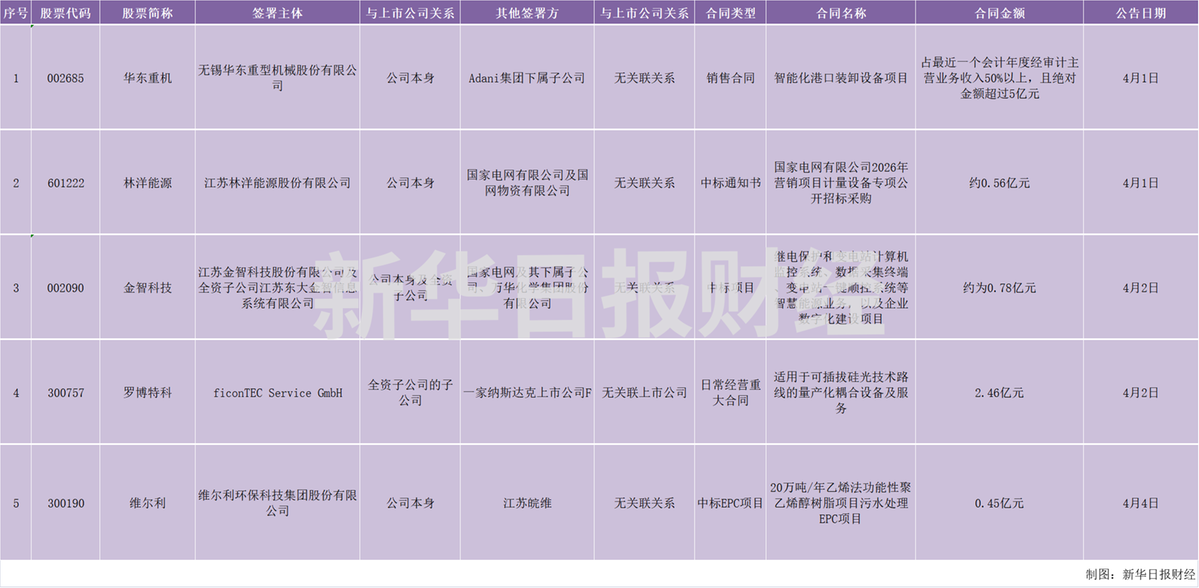 4月1日,无锡华东重型机械股份有限公司发布公告,公司已与Adani集团下属子公司就前期中标确认的智能化港口装卸设备项目完成了所有相关销售合同的签署。该项目预计于2027年至2029年分批交付,合同金额占公司最近一个会计年度经审计主营业务收入50%以上,且绝对金额超过5亿元。鉴于商业保密要求,公司已履行信息披露豁免程序。合同的顺利履行将对公司未来年度经营业绩产生积极影响,有助于进一步提高公司在境外智能化港口装卸设备的市场占有率。