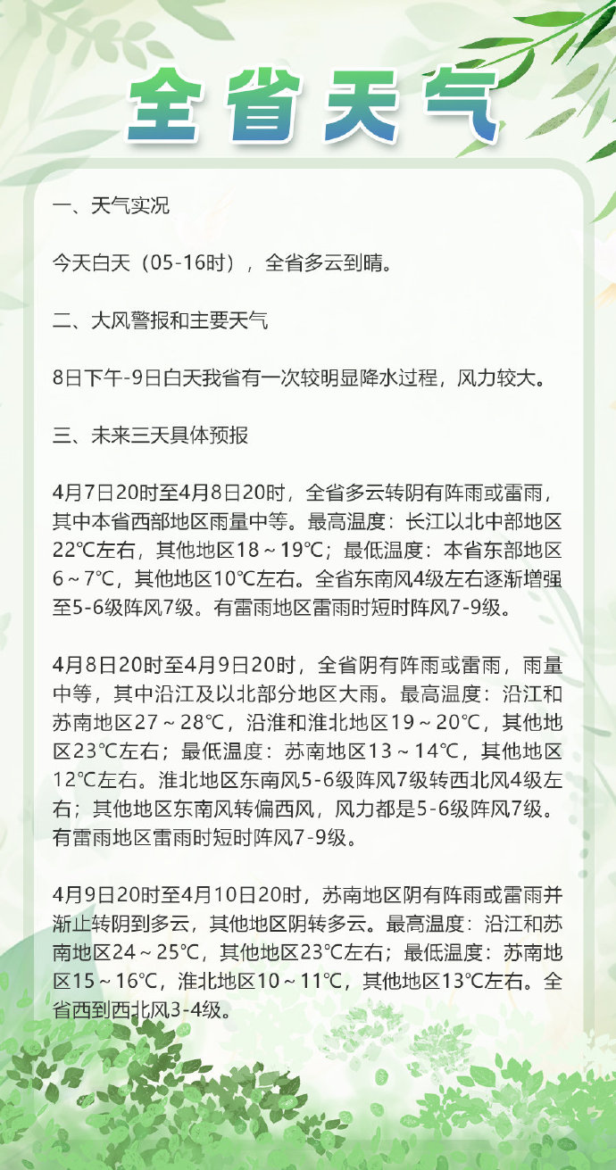 4月7日20时至4月8日20时,全省多云转阴有阵雨或雷雨,其中本省西部地区雨量中等;最高温度:长江以北中部地区22℃左右,其他地区18~19℃;最低温度:本省东部地区6~7℃,其他地区10℃左右;全省东南风4级左右逐渐增强至5—6级阵风7级,有雷雨地区雷雨时短时阵风7—9级。