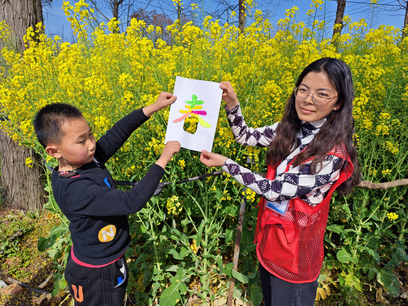 活动现场暖意融融,分为“春日涂鸦”与“踏青寻春”两大板块。在涂鸦区,大家拿着彩笔在画纸上填充着自己喜欢的春天的颜色,残疾人朋友与志愿者默契协作,用画笔绘制着五颜六色的“花”,自由发挥,将对春天的想象化作五彩斑斓的作品。随后,大家前往附近的油菜花田与桃林。大家拿着自己涂鸦的画纸摆出各种姿势拍照,志愿者用相机记录下一张张灿烂的笑脸。