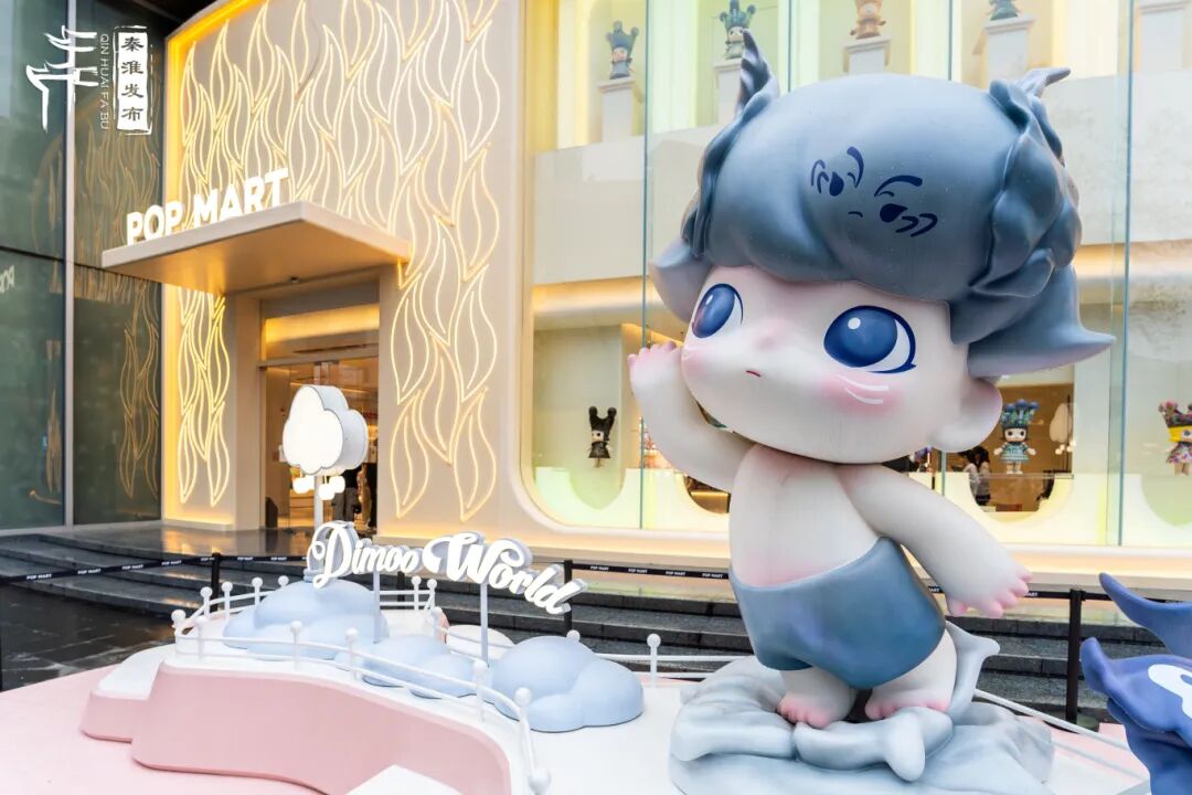 从中山南路来到中央商场,远远看到两尊巨大的Dimoo,这本是盲盒里的方寸之物,如今被放大成一层楼高的巨型玩偶,让人仿佛一下子进入一个属于泡泡玛特的异想世界。